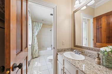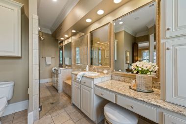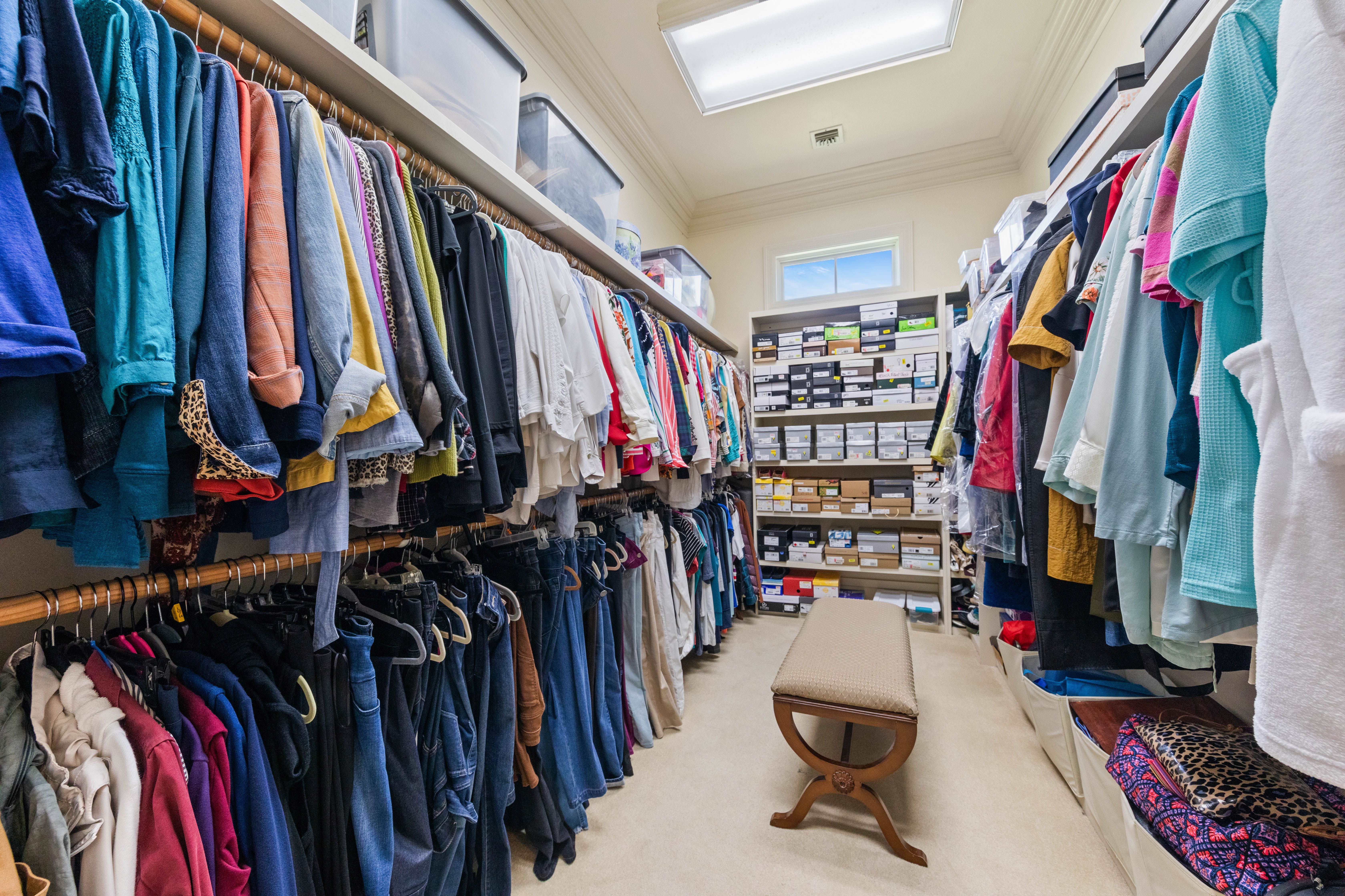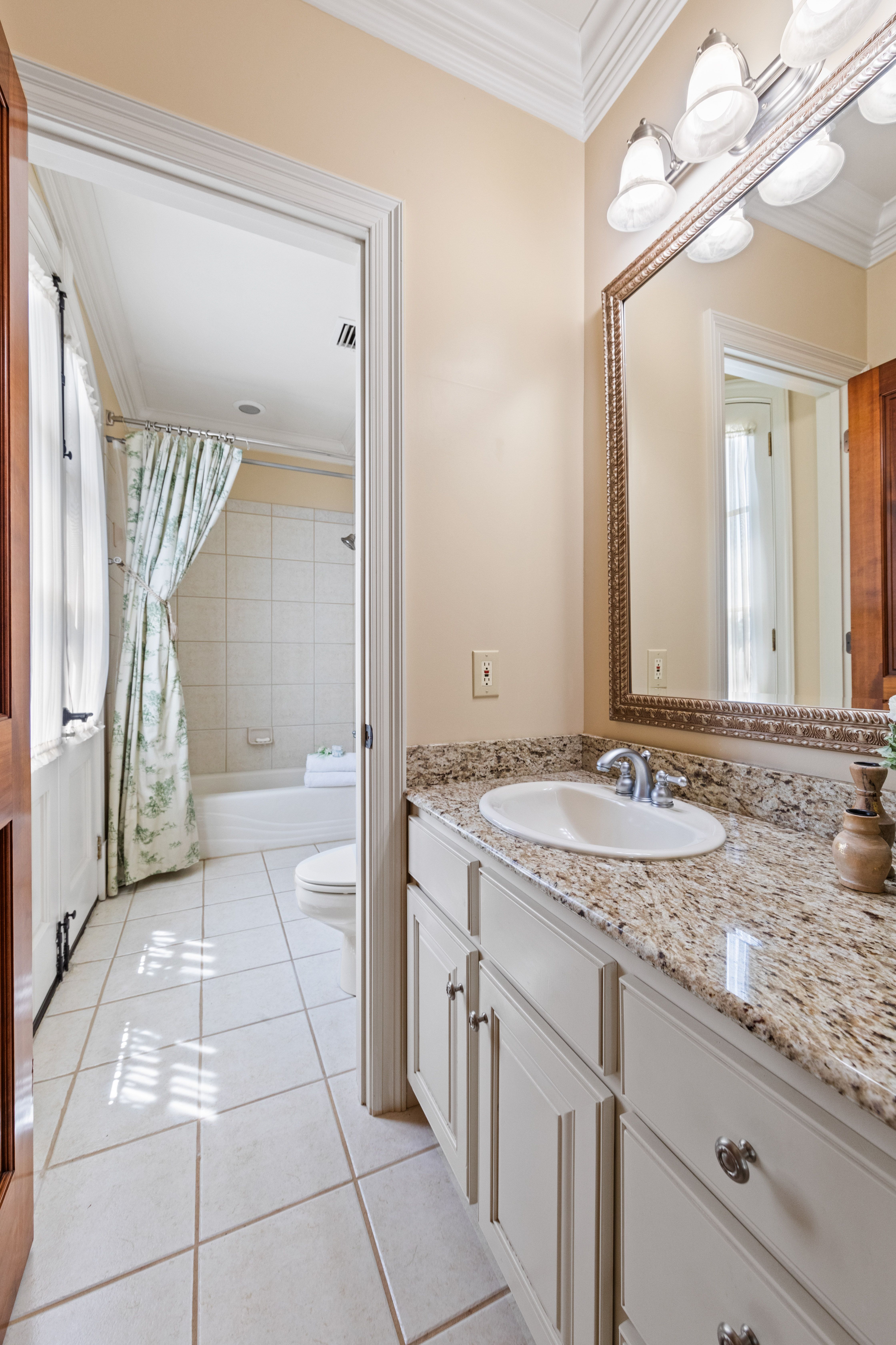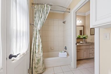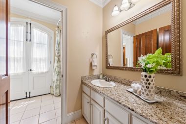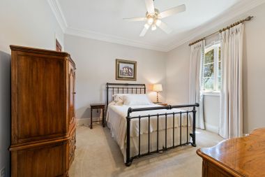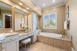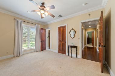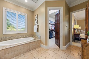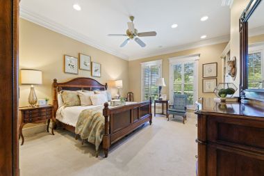 Indulge in comfort and elegance in the primary suite, where tranquil views and refined finishes create a serene atmosphere. Crown molding, plantation shutters, and soft neutral tones set a restful tone. The spa-inspired ensuite features dual vanities, granite counters, a soaking tub beneath a picture window, a walk-in shower with bench, and abundant built-in storage. The generously sized closets include custom organization for effortless daily living.