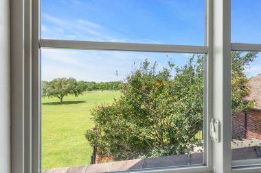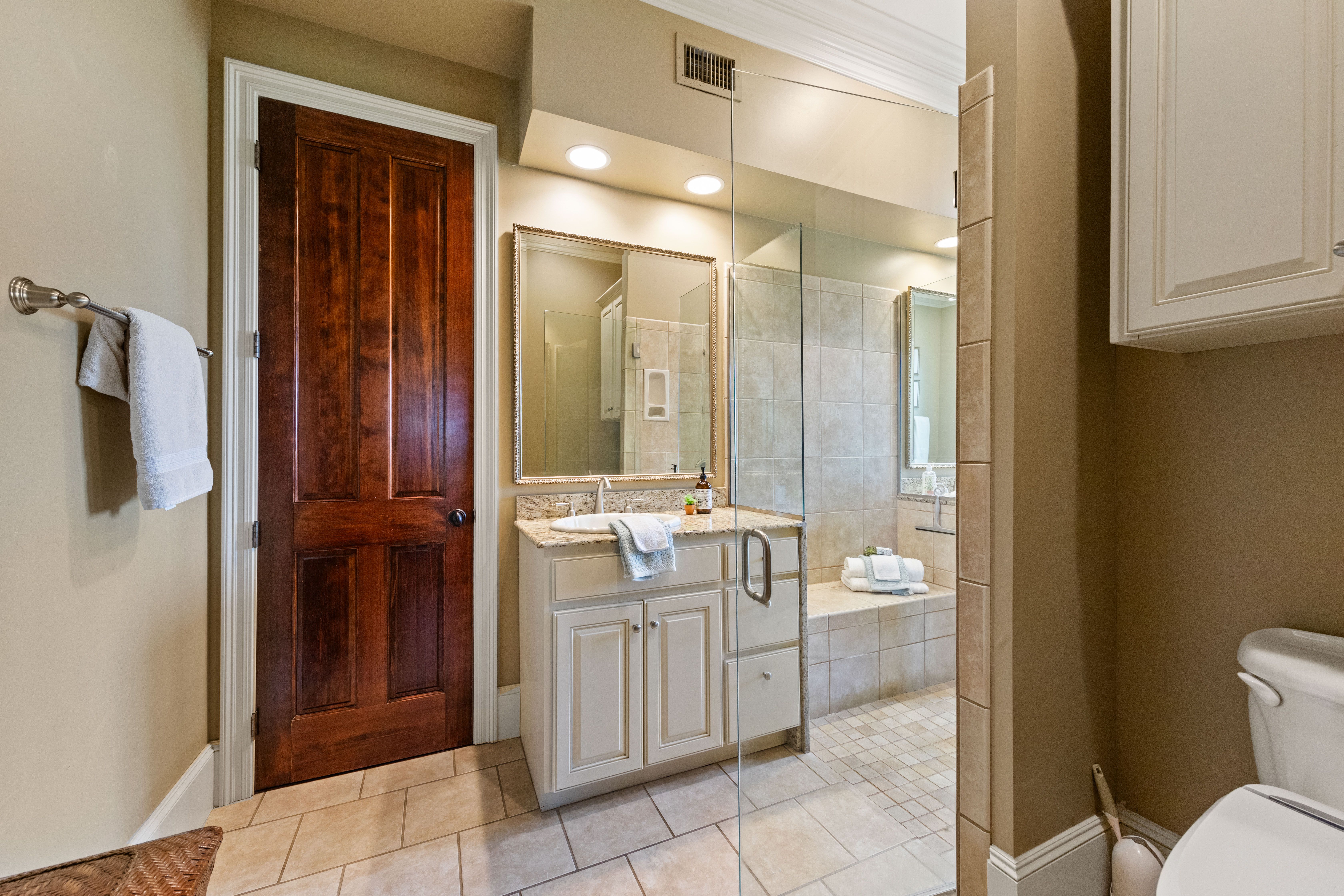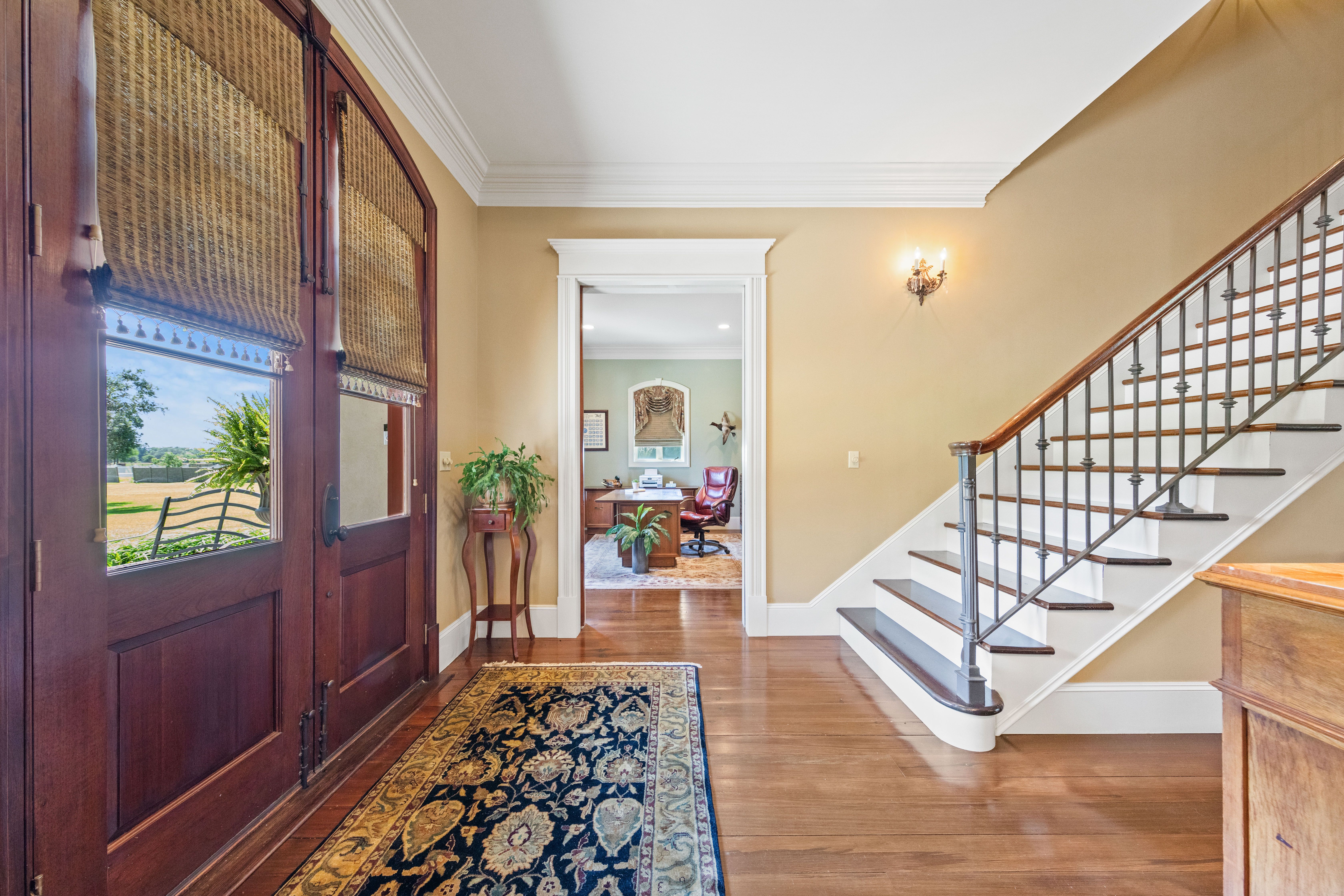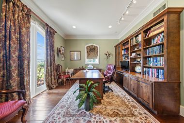 This elegant home office blends function with sophistication. Antique pine floors, a full wall of custom cabinetry, and abundant natural light create a space ideal for focus and inspiration. With direct access to the primary bath and serene views, this private retreat is perfectly suited for work, study, or quiet reflection within the heart of the home.